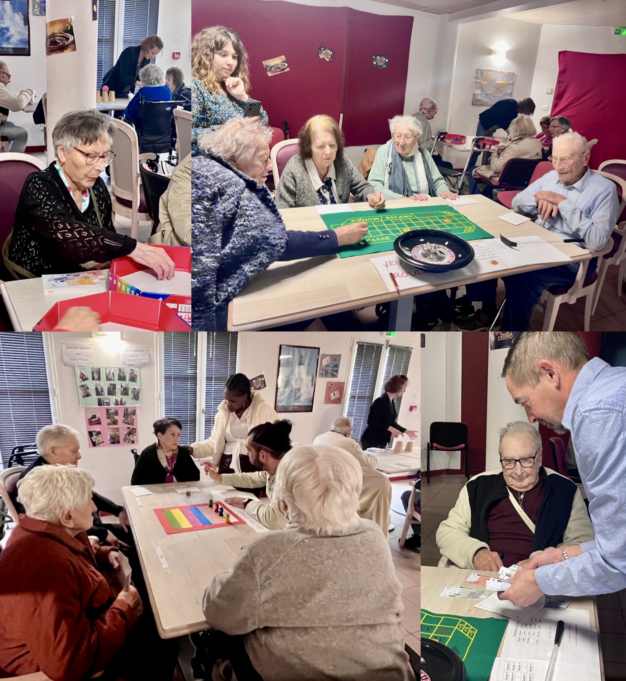 Aujourd’hui, nous avons été invités à l’EHPAD de Charron qui organisait une journée sur le thème du casino. Les résidents disposaient chacun de 355 € (de faux billets bien sûr ?) et pouvaient miser sur 5 jeux différents tout au long de la journée.