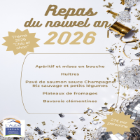 Menu du 1er janvier 2026 1er janvier 2026 Le menu du 1er janvier 2026 est sorti!!!! famille ou ami(s), réservez vite votre repas avec votre proche pour un repas avec un thème "chic et choc"!